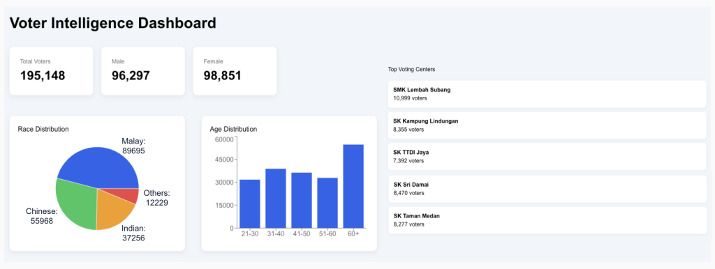 Agmo’s election AI strategy includes the concept of a voter intelligence dashboard that visualises campaign-relevant insights such as audience distribution, demographic patterns, locality-level priorities, and engagement opportunities.