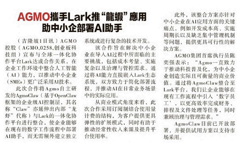 Agmo Group is the first Lark partner in the region to launch AgmoClaw, an AI agent solution powered by OpenClaw.