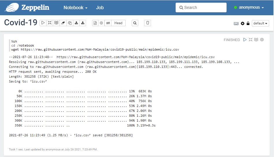 Create a notebook in Zeppelin. We will start by downloading the latest ICU CSV data from Github and save it into the /notebook directory.